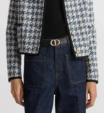The 30 Montaigne belt is inspired by the hallmark namesake bag. Exemplifying House savoir-faire, the black smooth calfskin style is enhanced by the iconic CD buckle in shiny gold-finish metal, set with white resin pearls in varying sizes on the letter C. The contemporary, elegant belt can be paired with jeans, a skirt or a dress.
