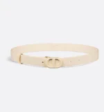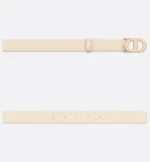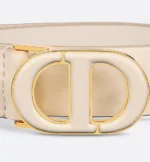 The 30 Montaigne belt is inspired by the hallmark namesake bag. Exemplifying House savoir-faire, the light ivory smooth calfskin style is enhanced by the iconic CD buckle in shiny gold-finish metal and tonal calfskin. The contemporary, elegant belt can be paired with jeans, a skirt or a dress.