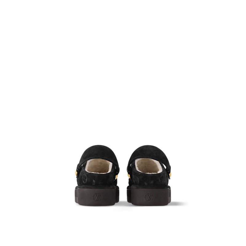 This wintry interpretation of the Aspen platform clog comes in suede calf leather debossed with the Monogram pattern and lined with snug shearling. This on-trend, easy-to-wear style features a removable back strap, which is secured with engraved, gold-toned studs. It is finished with a chunky rubber outsole whose tread is decorated with Monogram Flowers.