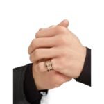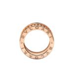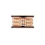 The B.zero1 Rock collection draws inspiration from the world-famous amphitheater, the Colosseum, and reflects Bvlgari??s creative vision and uninhibited style. The unique spiral design is reinterpreted with gold studs, challenging the essence of jewelry aesthetics and highlighting the freedom and forward-looking spirit of Bvlgari??s classic design. B.zero1 Rock collection 18K rose gold four-band ring inlaid with black ceramic.