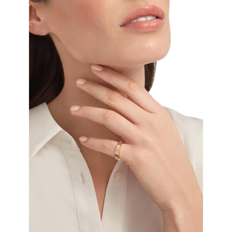 The B.zero1 Essential ring in 18K rose gold and set with a single diamond is a modern interpretation of elegance rooted in Bvlgari??s Roman heritage. This ring is a reflection of the collection??s aesthetic, reinterpreting the prestigious brand logo as a unique and classic design element. This versatile piece can be easily layered to create a variety of modern and timeless looks, and cleverly express your personality.
