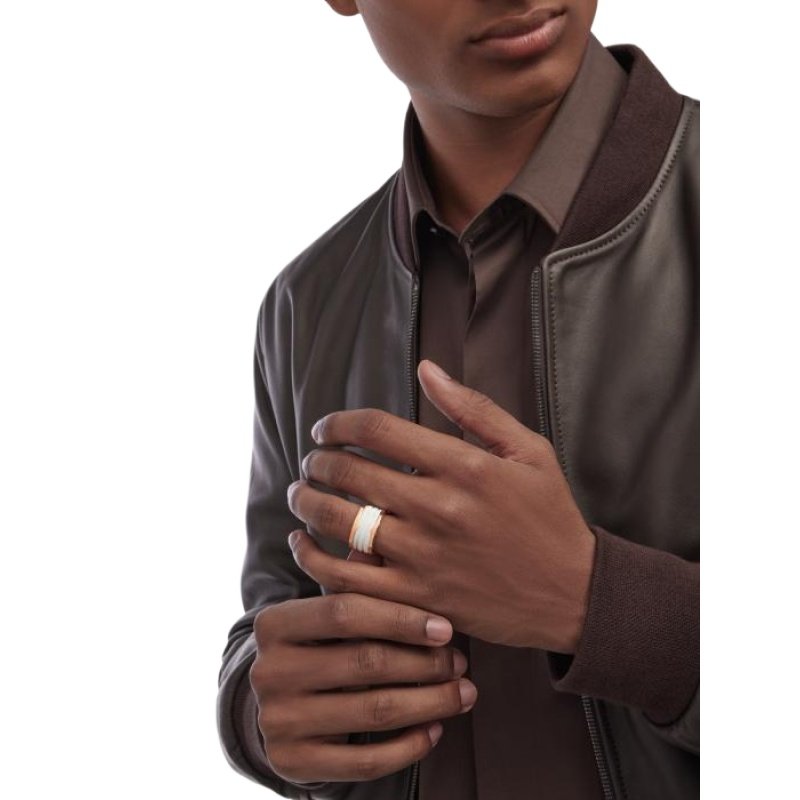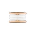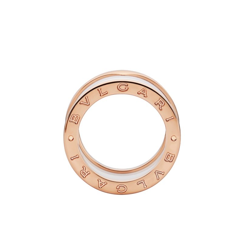 Inspired by the world-famous amphitheater, the Colosseum, the B.zero1 ring is a true expression of Bvlgari??s creative vision, challenging the very essence of jewellery design. Its unique, pure spiral shape symbolises the harmony of past, present and future ?C reflected in the magnificence of the Eternal City ?C and the pioneering spirit of the collection. B.zero1 four-band ring in 18K rose gold, adorned with white ceramic.
