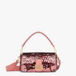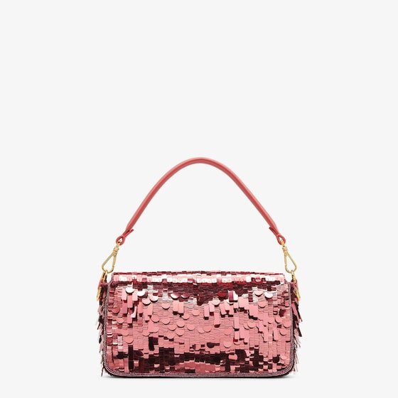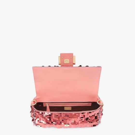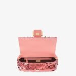 Hand-embroidered with pink sequins of different shapes and sizes. Trimmed with pink calfskin and embellished with an enameled FF clasp enhanced with glitter.
