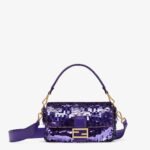 Iconic medium Baguette bag finely embroidered all-over with purple sequins of different shapes and sizes to create a 3D effect and decorated with an FF clasp. This style is a re-release of the original version first introduced in the Autumn/Winter 1999-2000 Collection. Features a front flap, tone on tone leather details and magnetic clasp. Internal compartment with zip pocket and gold-finish metalware. The bag can be carried by hand, or worn either on the shoulder or cross-body thanks to the leather handle and shoulder strap, both detachable.