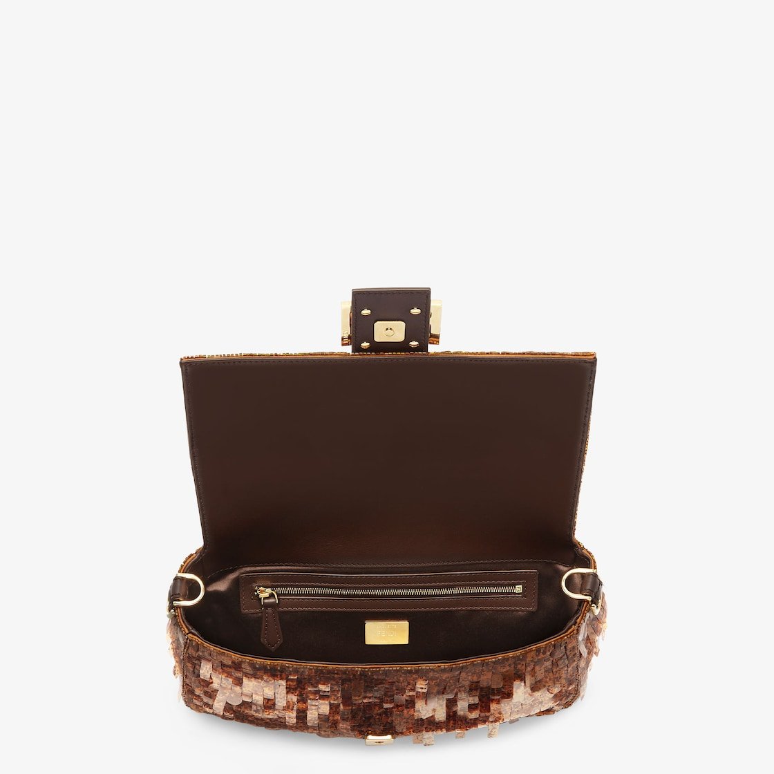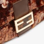 Hand-embroidered with brown tortoiseshell-effect sequins of different shapes and sizes. Trimmed in brown calfskin and embellished with an FF clasp with tortoiseshell plexiglass filling.