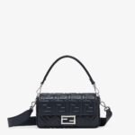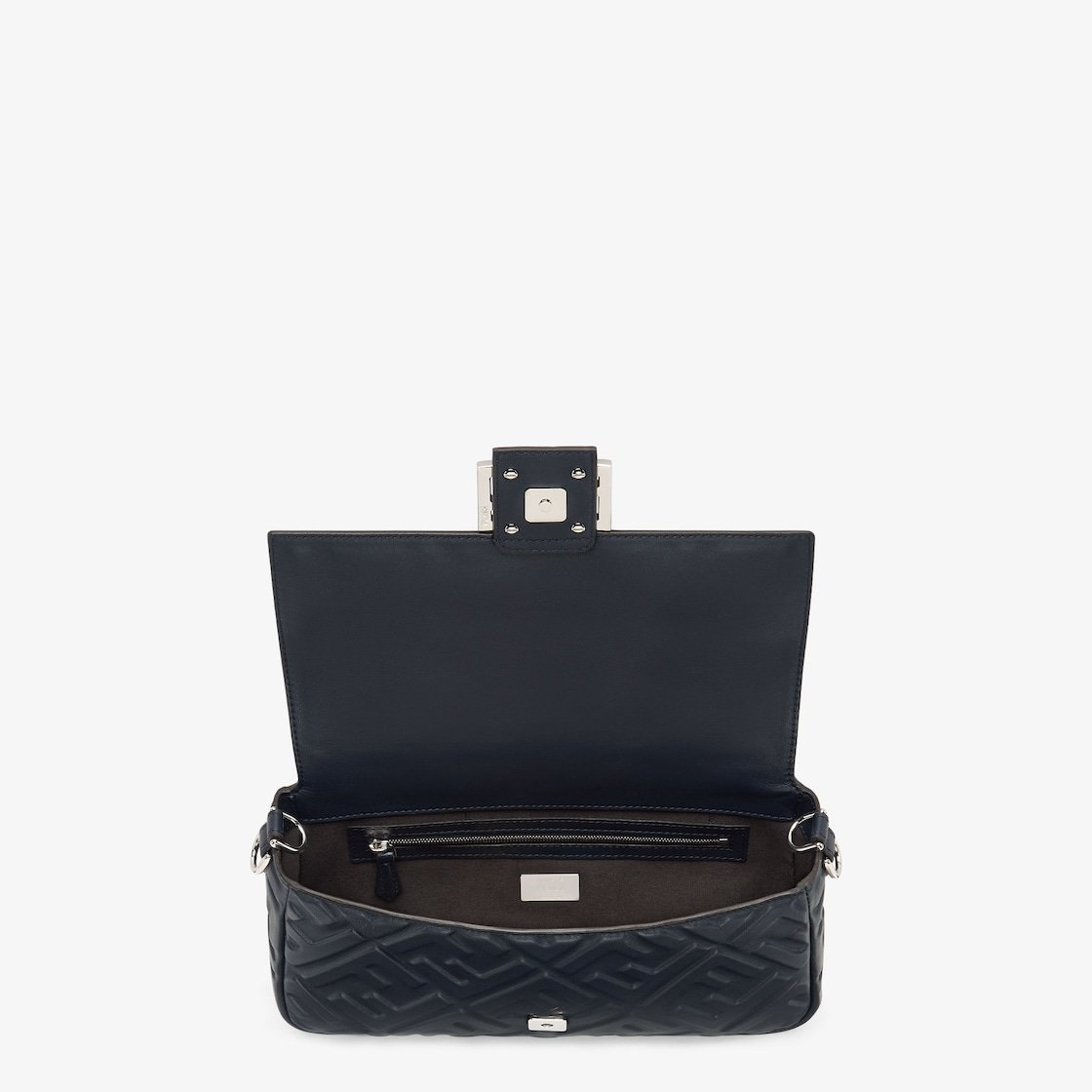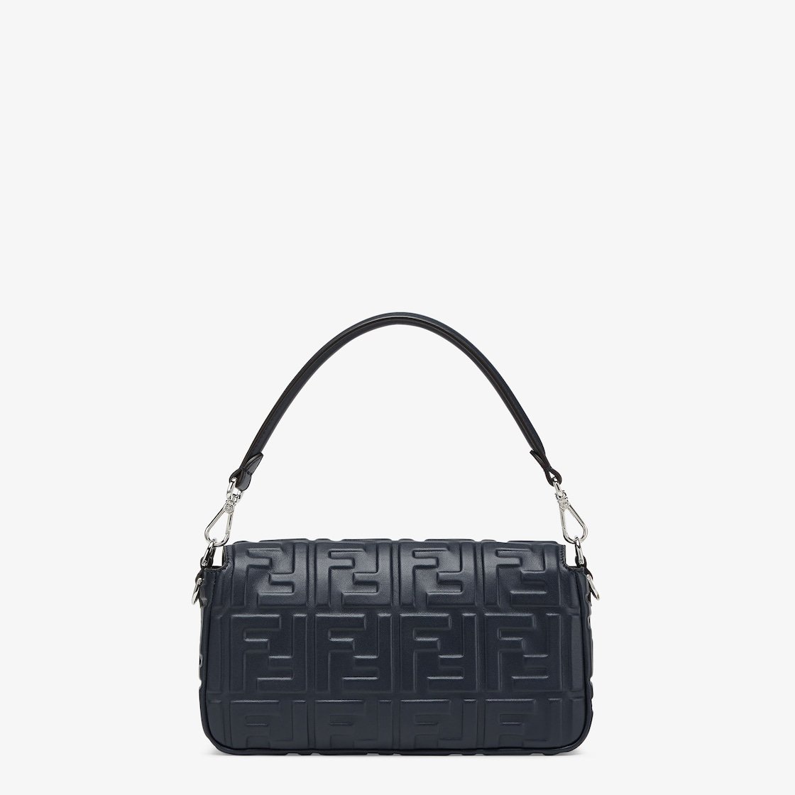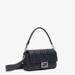 Iconic medium Baguette bag made of midnight blue soft nappa leather with a three-dimensional texture embossed FF motif. Decorated with an FF clasp.