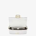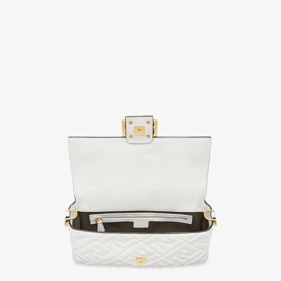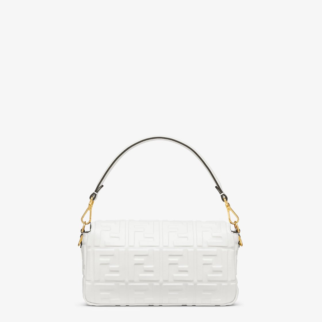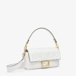 Iconic medium Baguette bag made of white soft nappa leather with a three-dimensional texture FF motif. Decorated with an FF clasp.