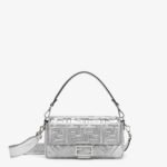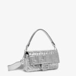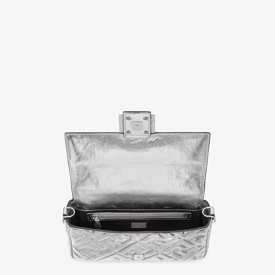 Iconic medium Baguette bag made of soft silver laminated nappa leather with a craquelé effect and 3D embossed FF motif. Decorated with an FF clasp.