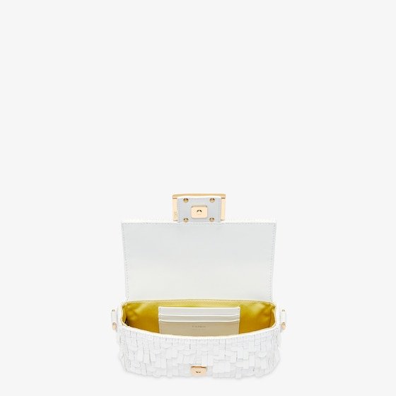 Iconic mini Baguette bag embroidered all-over with white metallic sequins in different shapes and sizes. Decorated with an FF clasp.
