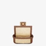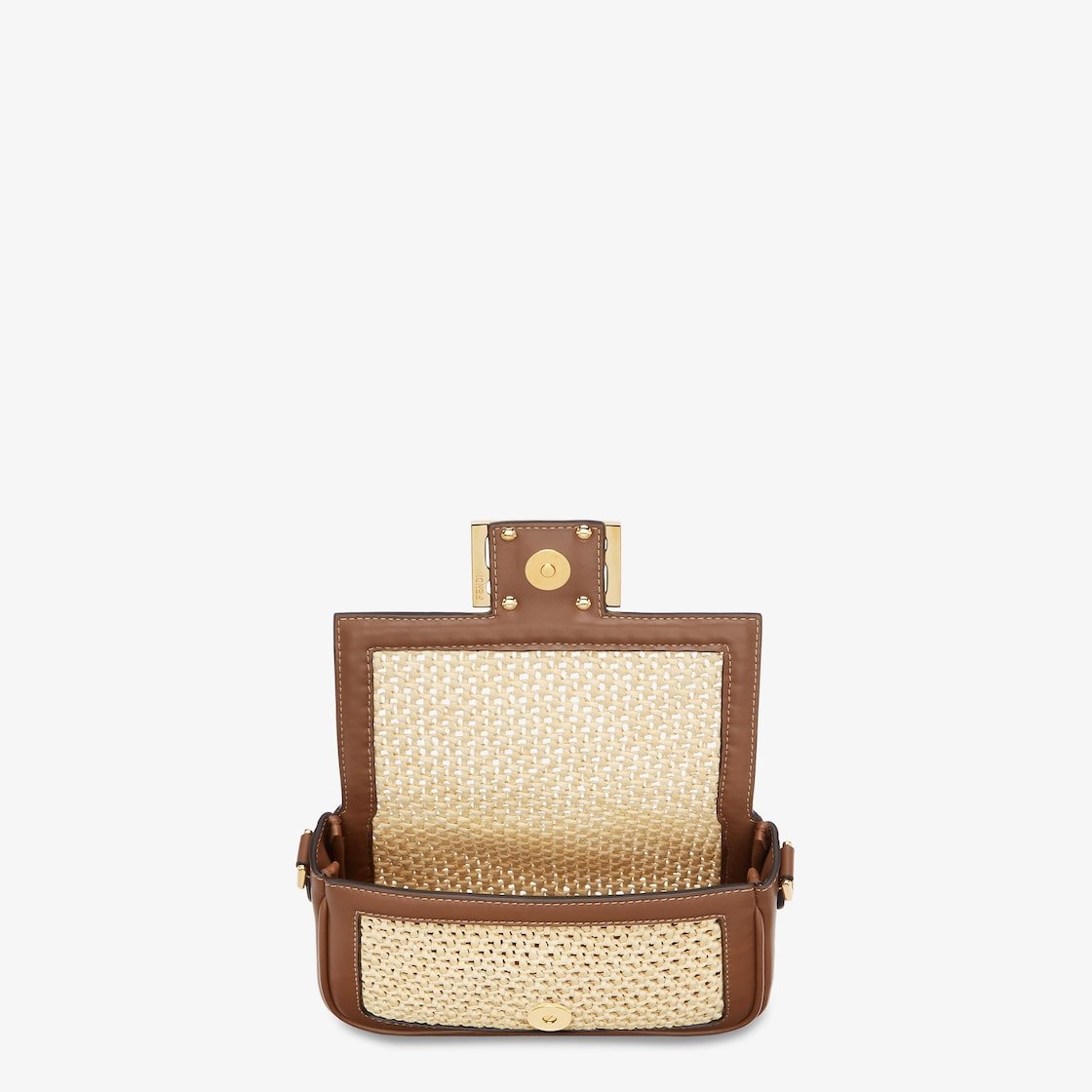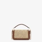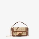 Iconic small Baguette bag, made of natural-colored macramé. Trimmed in brown calfskin and embellished with an FF clasp.