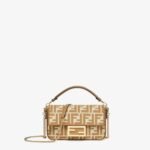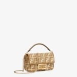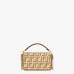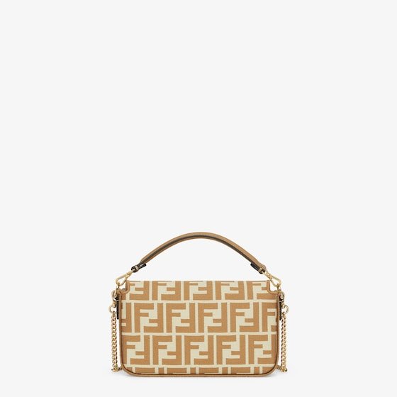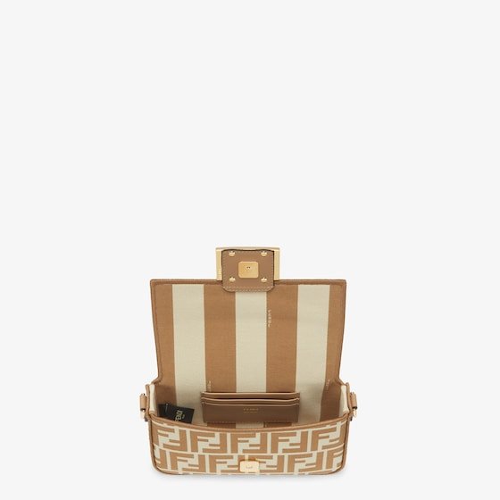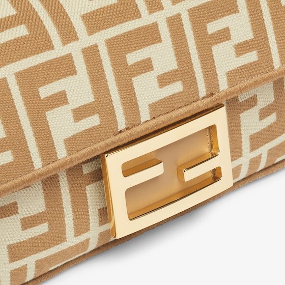 Iconic small Baguette bag made of jacquard fabric with the iconic FF motif in shades of beige, embellished with beige embroidered borders, beige leather details and embellished with an FF clasp.