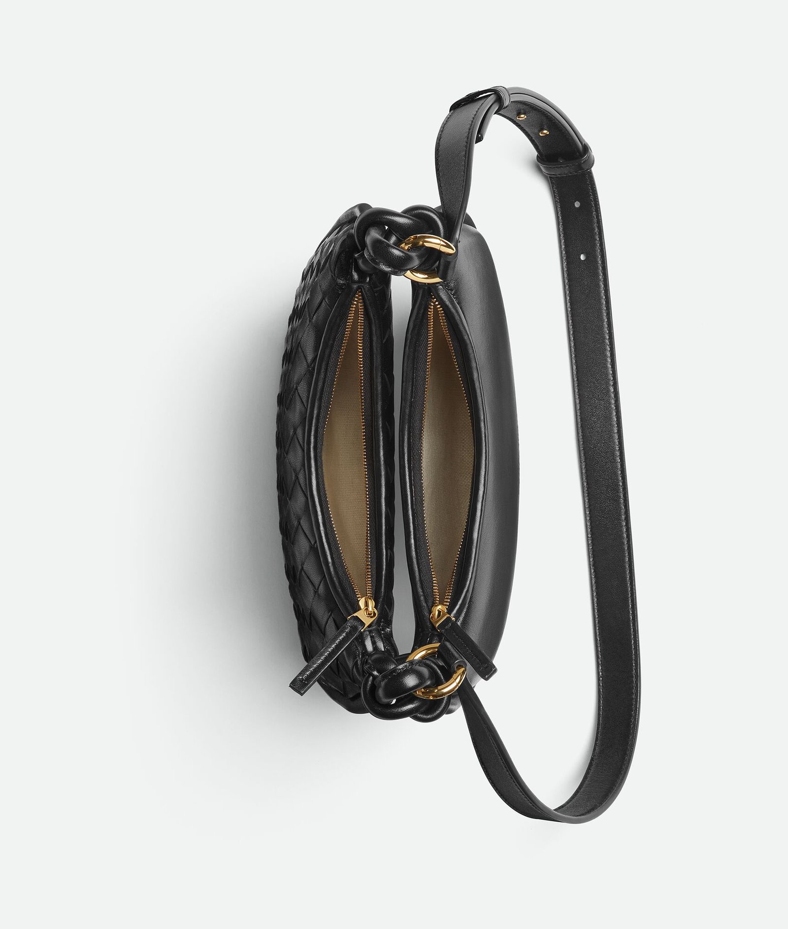 Small Intrecciato and smooth leather half-moon cross-body bag with adjustable strap