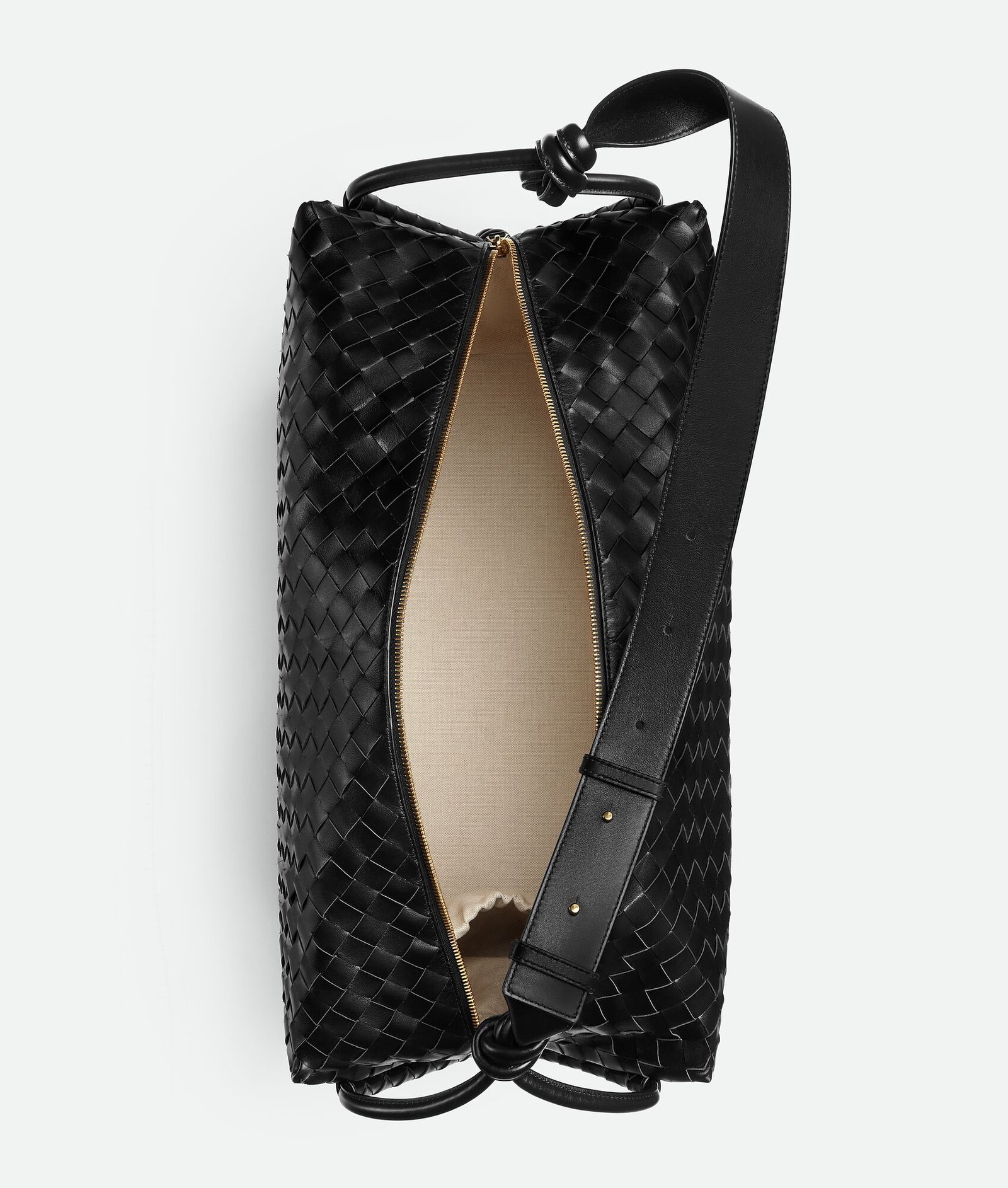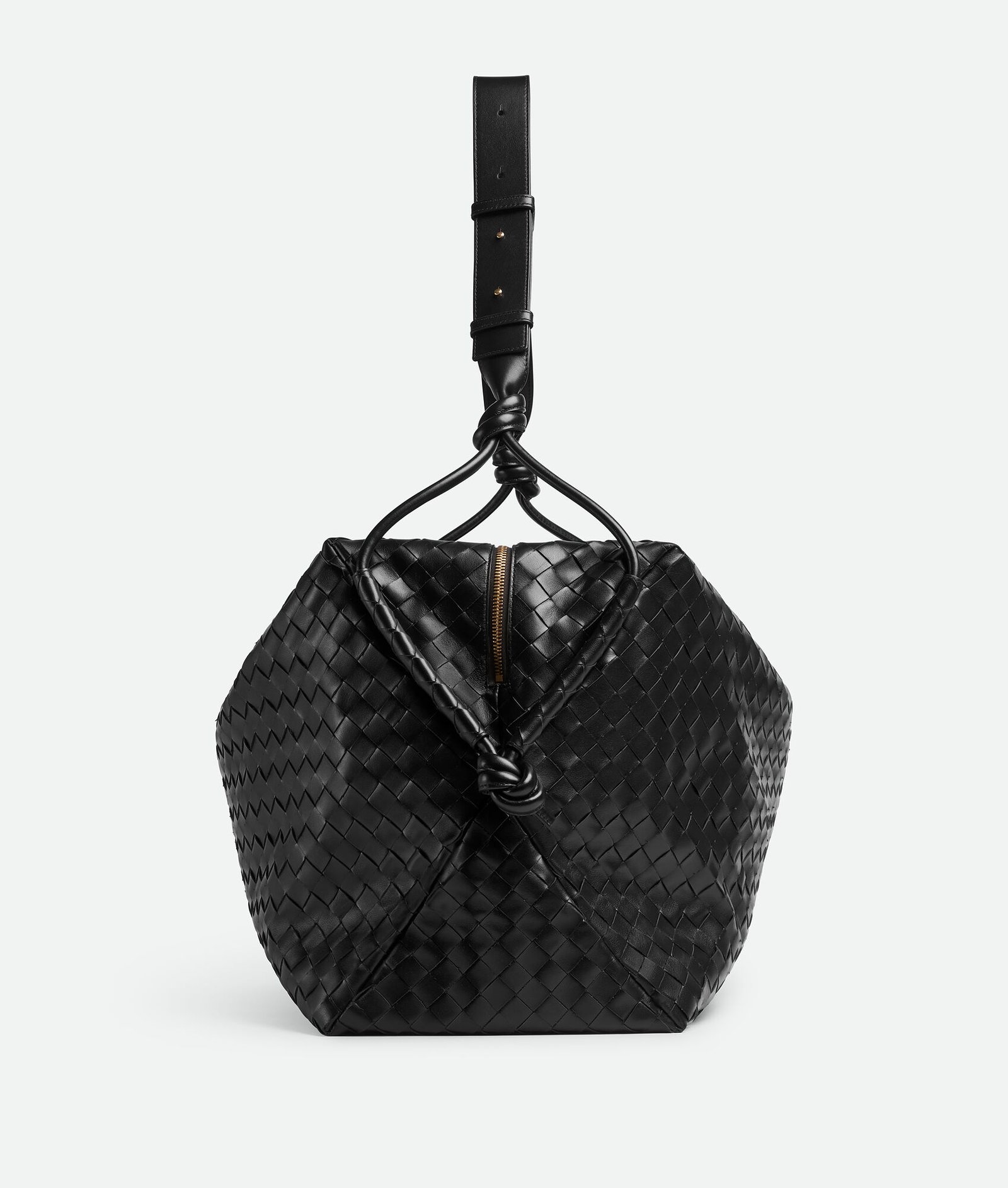 Large Intrecciato leather weekender with smooth leather strap adorned with four handmade leather knots