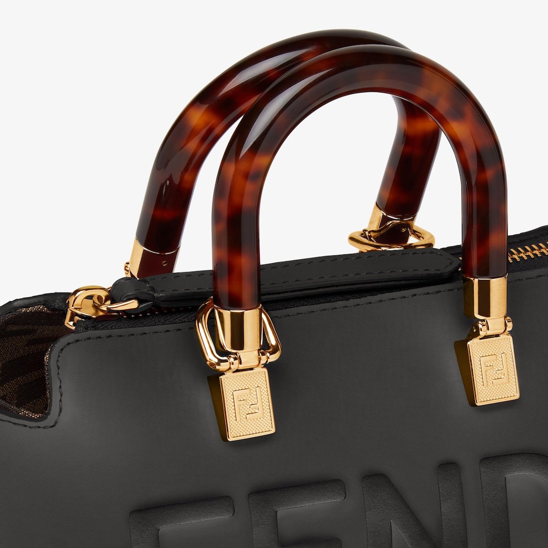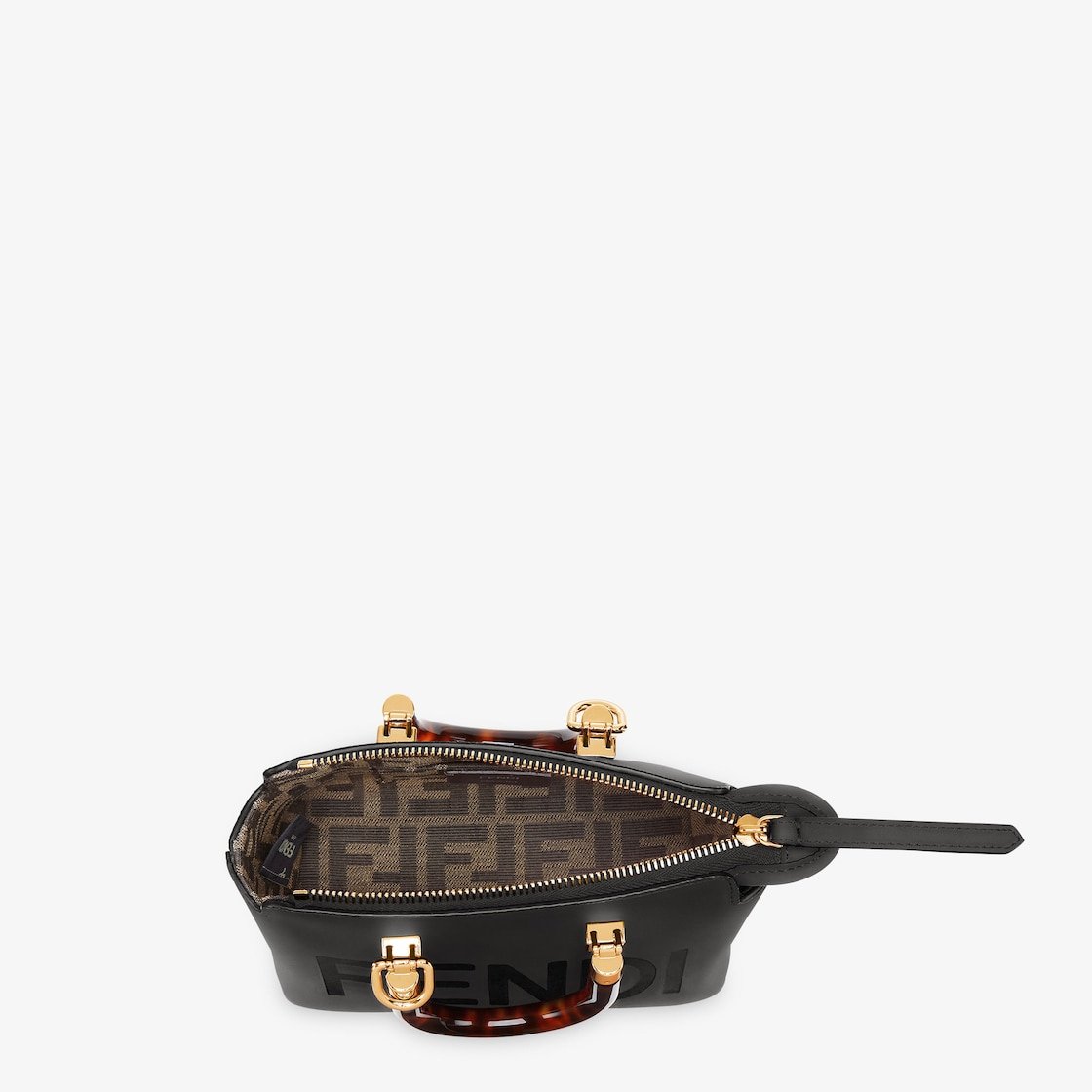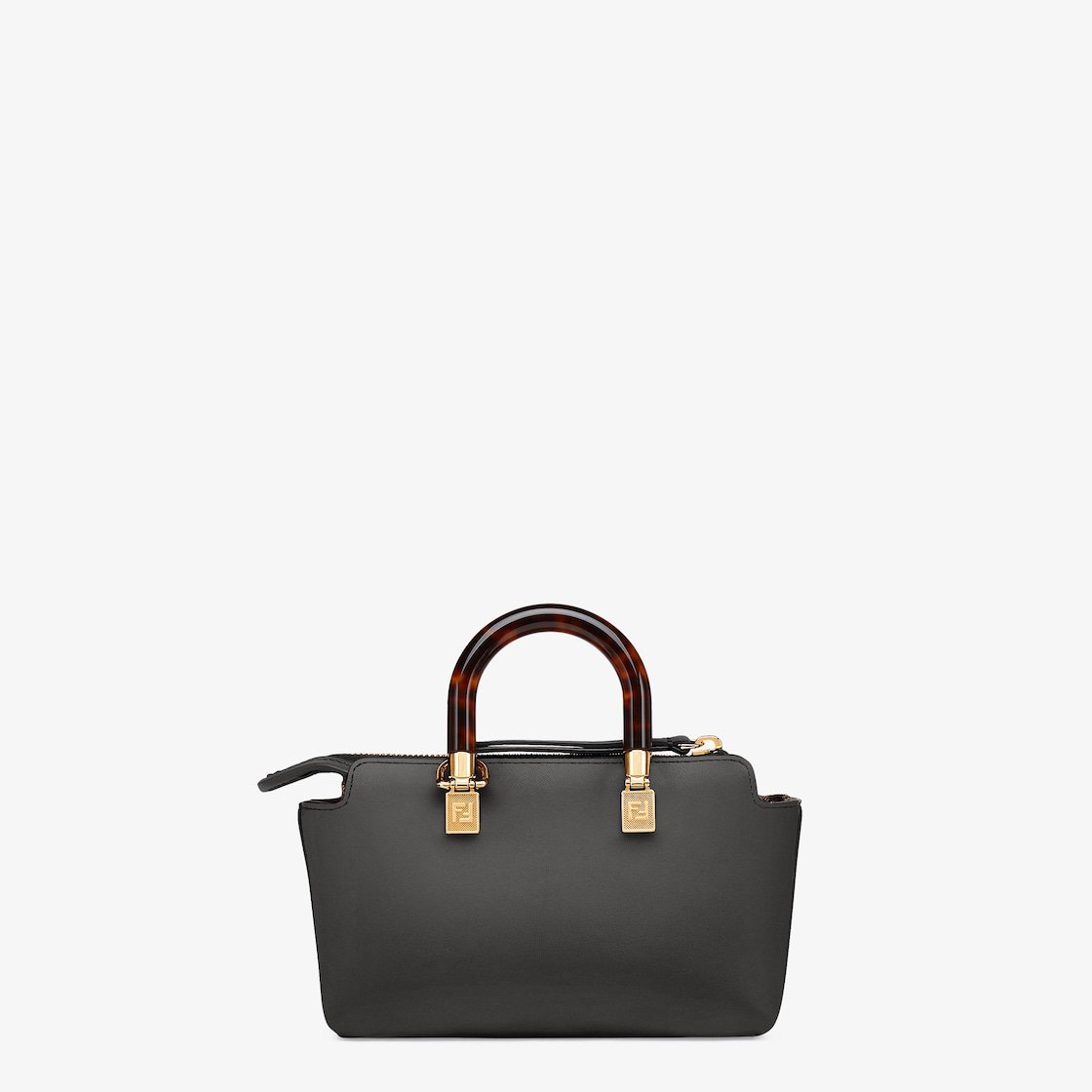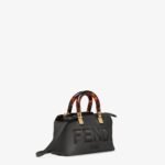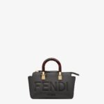 Iconic mini By The Way Boston bag made of black leather with hot-stamped FENDI ROMA lettering and rigid tortoiseshell-effect plexiglass handles. Zip fastening.