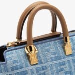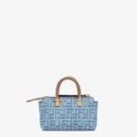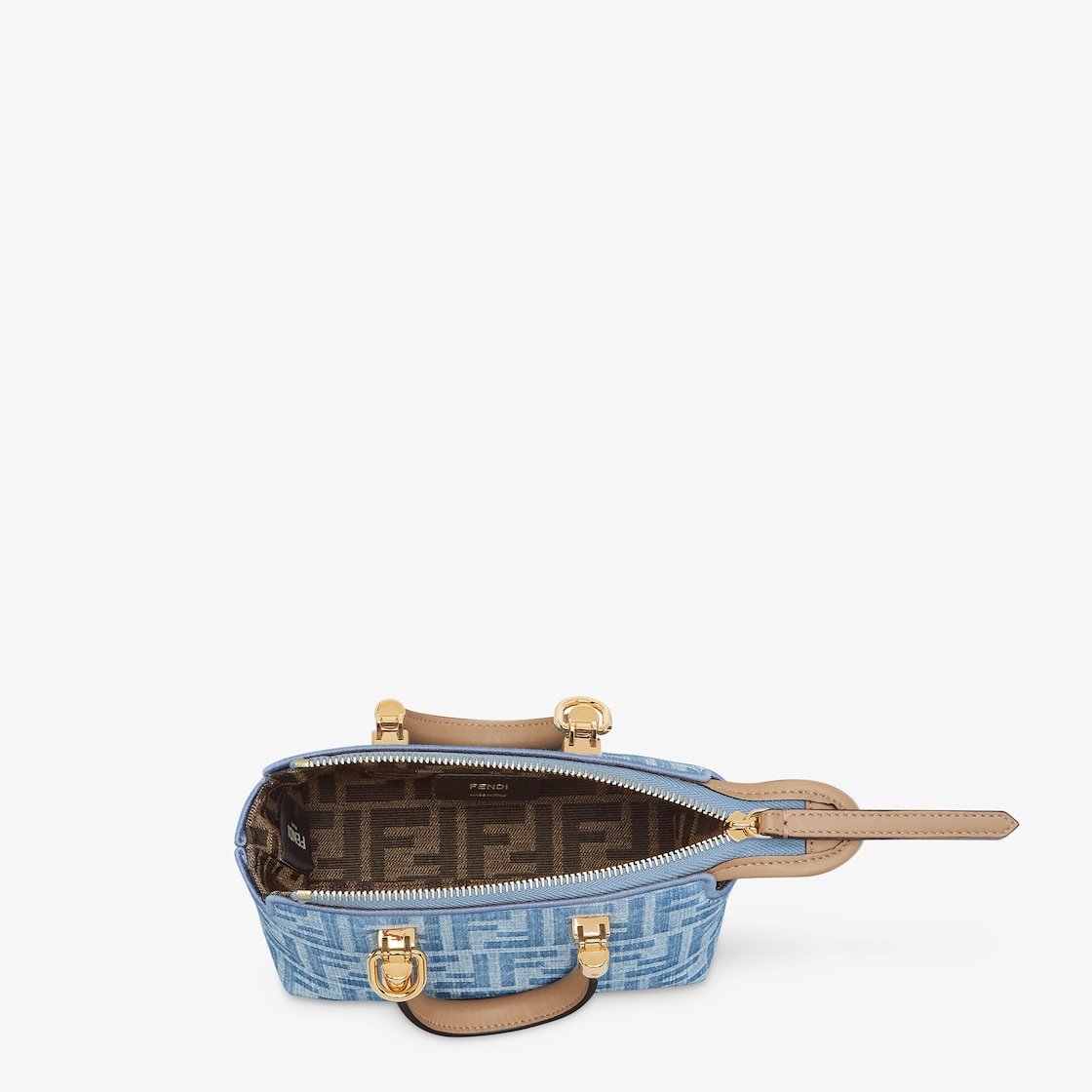 Mini By The Way Boston bag made of light blue denim-effect fabric with an FF motif. Embellished with beige leather details and tubular handles. Zip fastening.