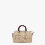 Iconic mini By The Way Boston bag made of dove gray leather with hot-stamped FENDI ROMA lettering and rigid tortoiseshell-effect plexiglass handles. Zip fastening.