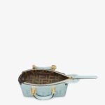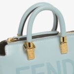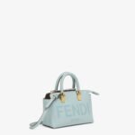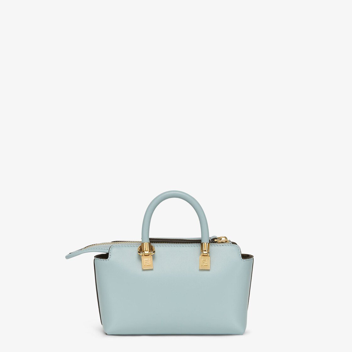 Iconic mini By The Way Boston bag, made of light blue leather with hot-stamped FENDI ROMA lettering and tone-on-tone leather tubular handles. Zip fastening.