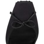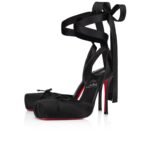 A testament to Christian Louboutin’s ‘savoir-faire’, the Cassia Lace Up pump has a square toe. Inspired by ballet slippers, they are made entirely from black crepe satin. Enhanced by a grosgrain trim, it sits on a 100 mm stiletto heel and ties around the ankle with a ribbon.