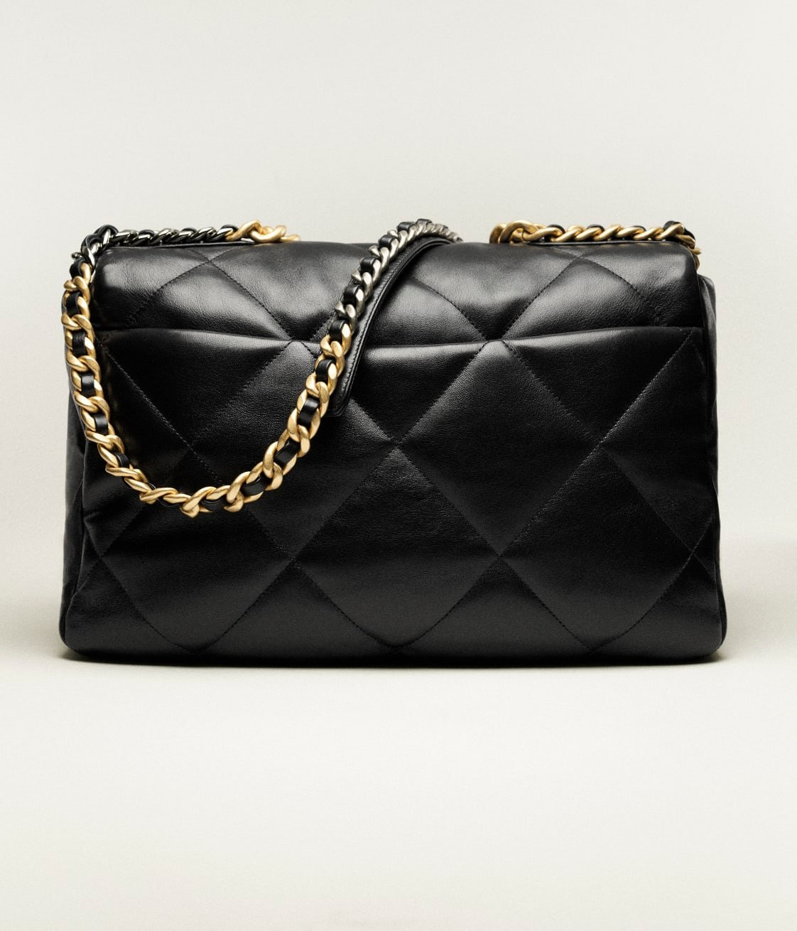 This oversized 19 flap bag is crafted in black lambskin with mixed metal hardware and features signature diamond quilting, the signature 19 CC interlocking clasp, exterior back pockets, chain top handles and a long shoulder strap in brushed gold, ruthenium and silver tones and a black leather chain.