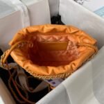 This mini 22 Hobo bag is made of orange calfskin with gold-tone hardware and features signature diamond quilting, gold-tone metal CHANEL lettering on the front, and a long chain interwoven with gold and orange leather.