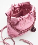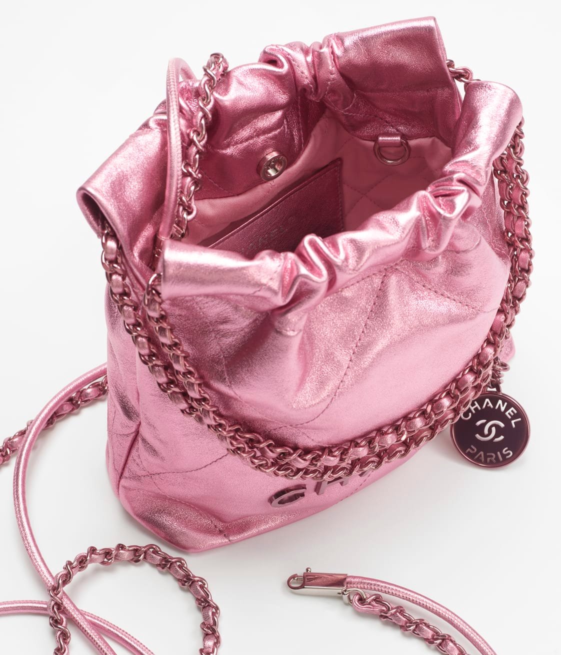 The Chanel Mini 22 Hobo Bag is crafted from pink metallic calfskin with pink hardware and signature diamond quilting, a pink lacquered metal ‘Chanel’ signature on the front, a Chanel Paris metal hangtag, pink metallic leather interlaced chain links, a long leather cord and a long chain link shoulder strap.