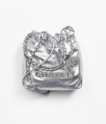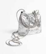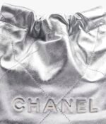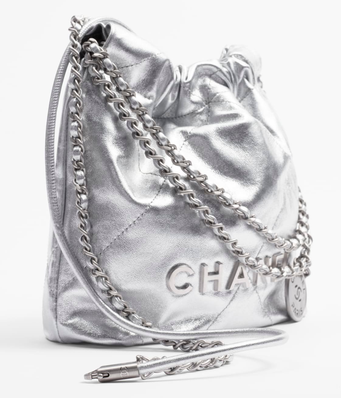 This Chanel Mini 22 Hobo Bag is crafted from silver-tone metallic calfskin with silver-tone hardware and signature diamond quilting, silver-tone lacquered metal “Chanel” signature on the front, Chanel Paris metal hangtag, silver-tone metal leather interlaced chain links, a long leather cord, and a long chain link shoulder strap.