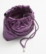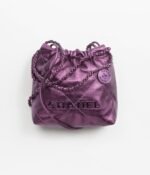 This Chanel Mini 22 Hobo bag is made of dark purple lacquered metallic calfskin with dark purple hardware and signature diamond quilting, dark lacquered metal “Chanel” logo on the front, Chanel Paris metal hangtag, dark purple metallic leather interwoven chain links, long leather cord and long chain link shoulder strap.