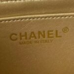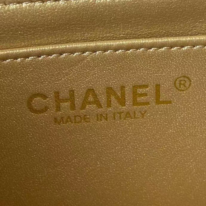 The interior is lined in gold metallic lambskin with a zip pocket with Chanel zipper and an open pocket underneath.