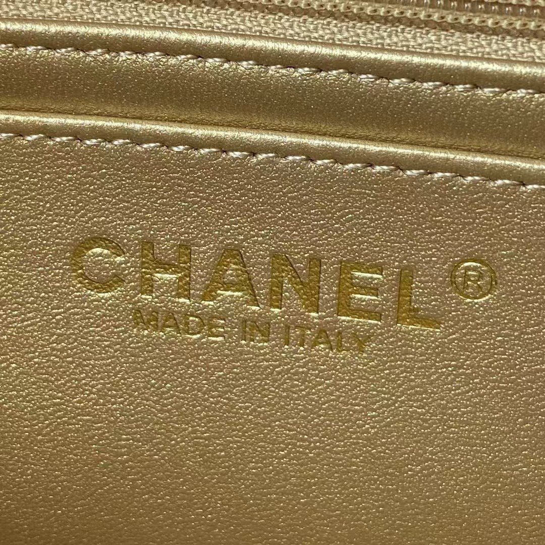 Interior lined with metallic gold leather with zippered pocket with Chanel zipper and open pocket underneath.