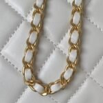 This CC shoulder bag features white lambskin with antique gold hardware, tonal stitching, circular construction, large antique gold CC buckle that folds over the front top of the bag.