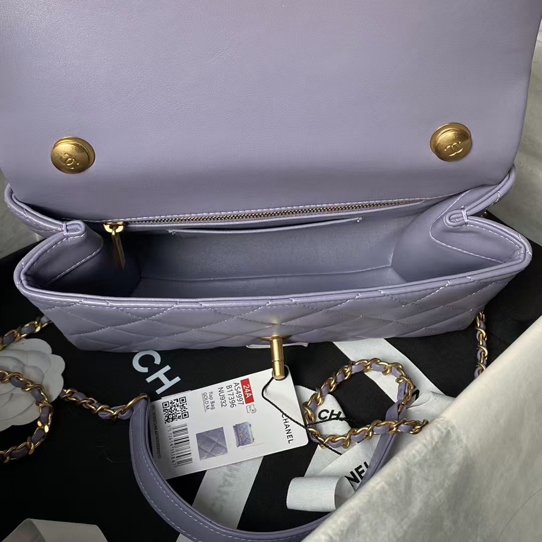 Chanel AS4997 Flap Bag With Top Handle Shiny Lambskin Imitation Pearls & Gold-Tone Metal Purple
