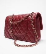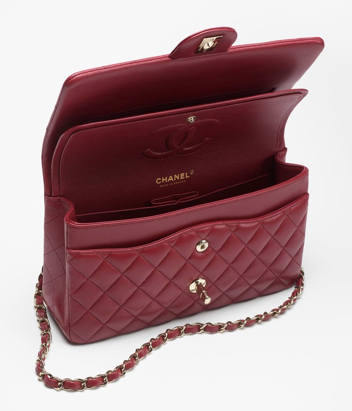 This flap bag is made of red lambskin with gold-tone hardware, front flap with signature CC turnlock closure, half-moon back pocket, adjustable gold-tone interwoven chain link and red leather shoulder strap.