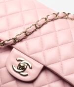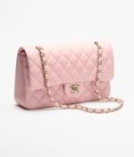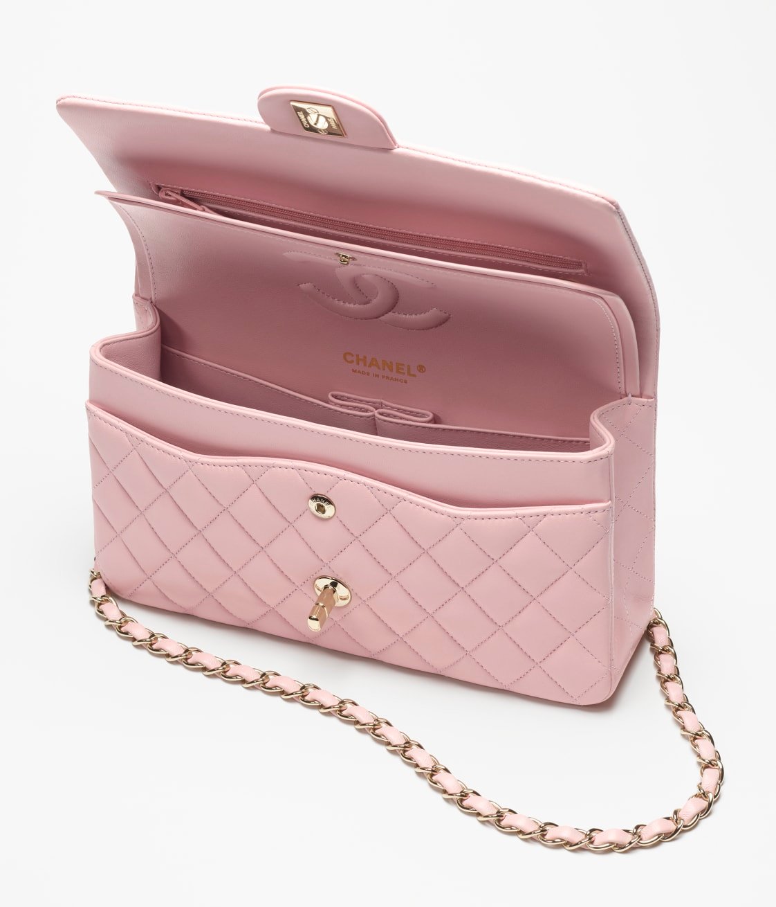 This flap bag is made of light pink lambskin with gold hardware, front flap with signature CC turnlock closure, half-moon back pocket, adjustable gold interwoven chain link and light pink leather shoulder strap.