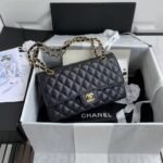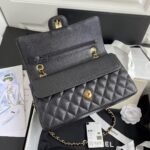 This medium classic double flap bag is crafted in black caviar leather with gold hardware, signature CC turnlock closure on the front flap, half-moon back pocket, adjustable interwoven gold chain and black leather shoulder strap.