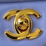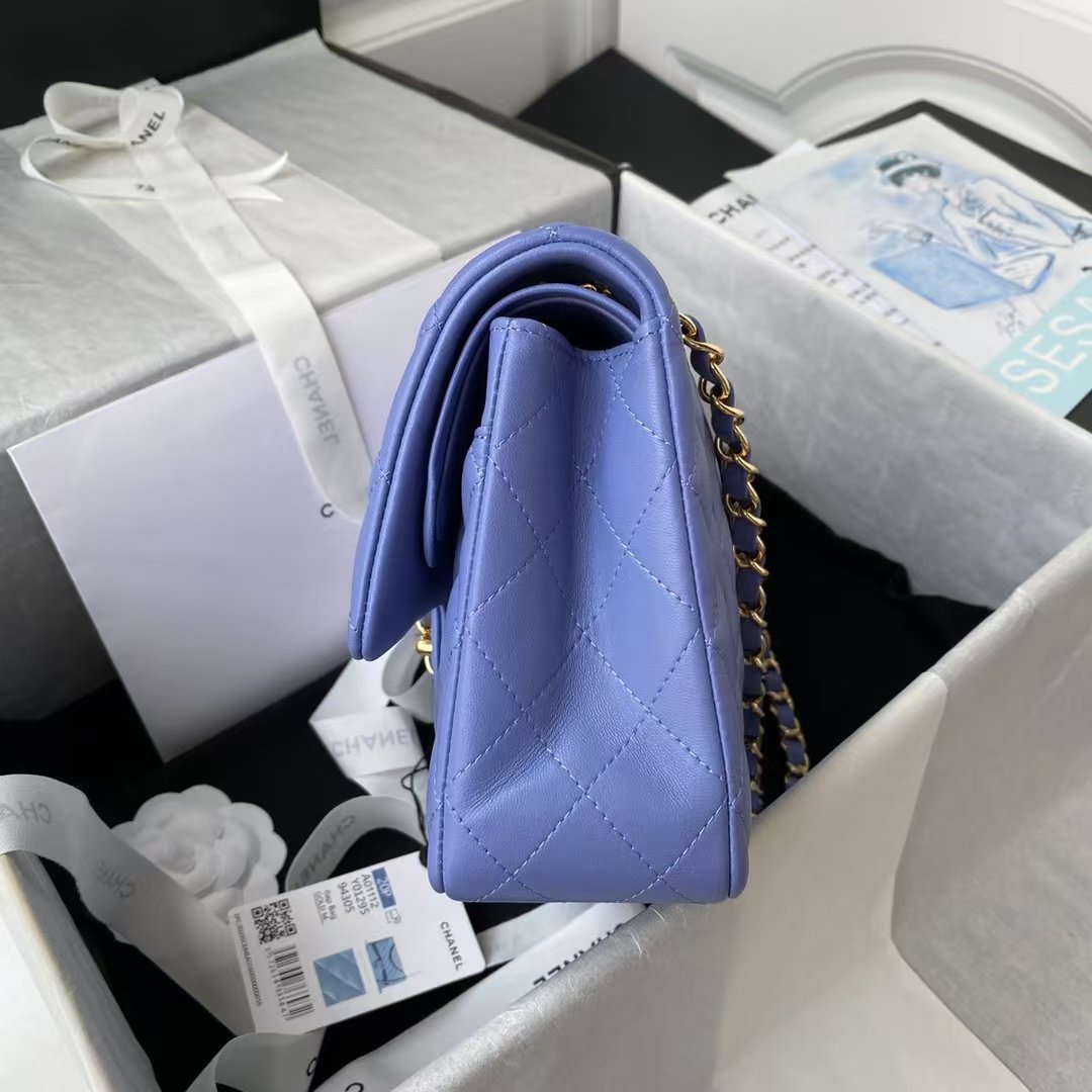 This medium classic double flap bag is crafted in lavender lambskin leather with light gold hardware, featuring the signature CC turnlock closure on the front flap, half-moon back pocket, adjustable interwoven light gold chain and lavender leather shoulder strap.
