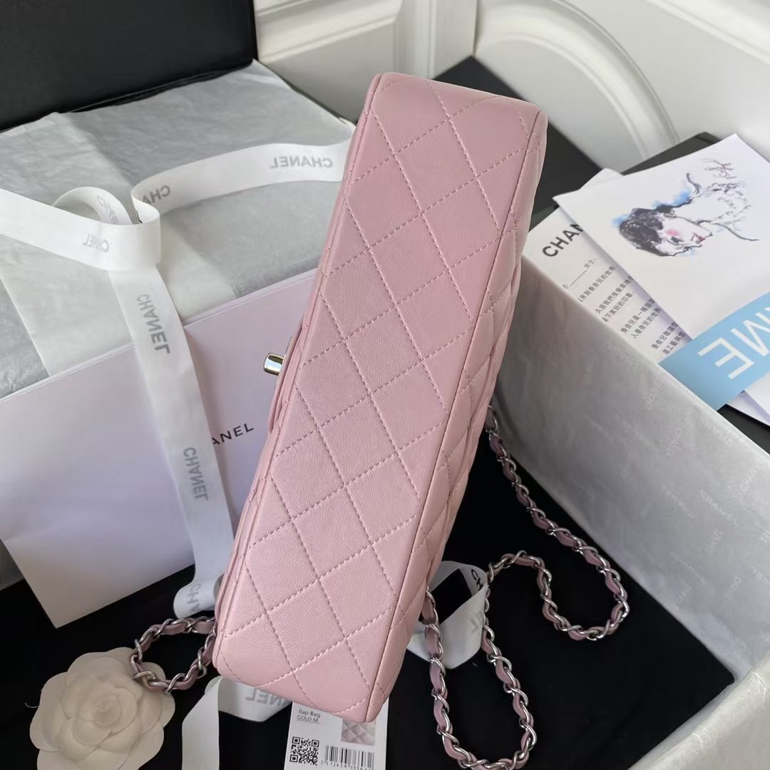 This medium classic double flap bag is crafted in dark pink lambskin with silver hardware, front flap with signature CC turnlock closure, half-moon back pocket, adjustable silver interwoven chain and dark pink leather shoulder strap.