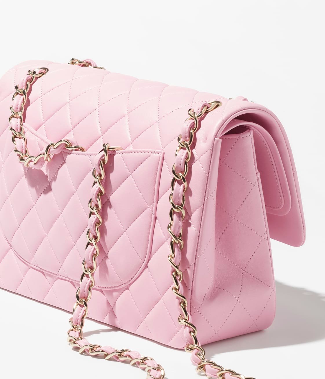 This Chanel Large Flap Bag is crafted from pink lambskin with brushed light gold hardware, front flap with large CC turnlock closure, half-moon back pocket, adjustable interwoven brushed light gold chain link and pink leather shoulder strap.