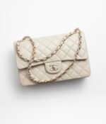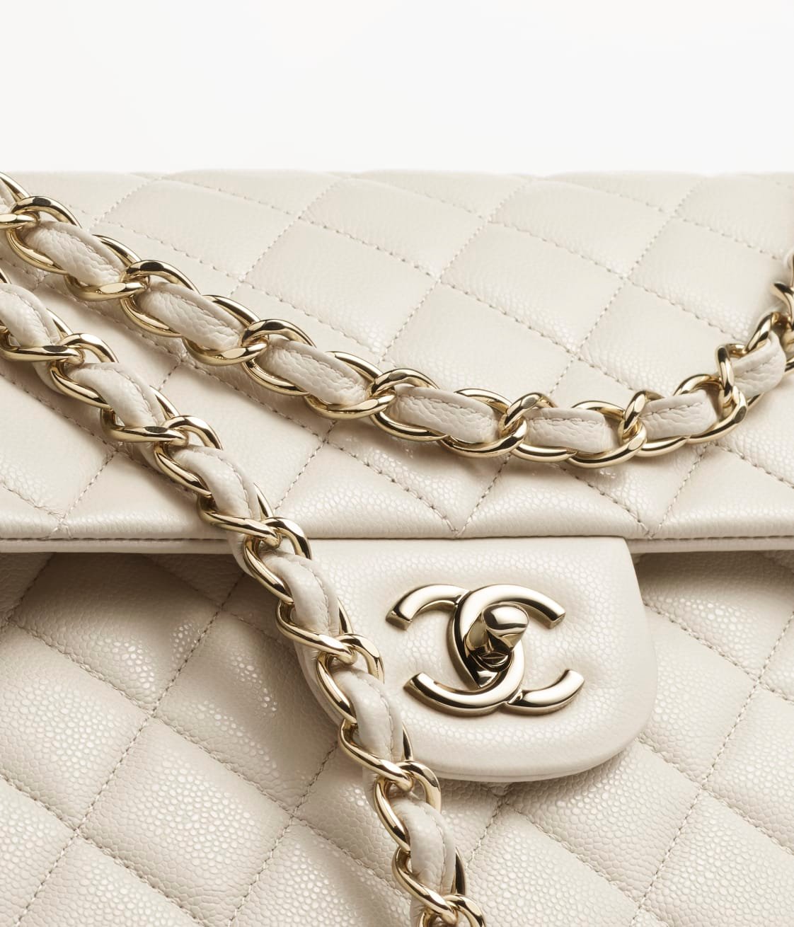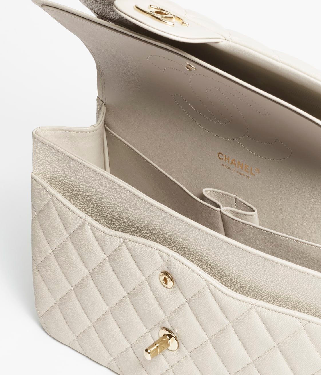 This Large Classic Double Flap Bag in white lambskin, gold-tone hardware, front flap with signature CC turnlock closure, half-moon back pocket, adjustable gold-tone interwoven chain link and white leather shoulder strap.