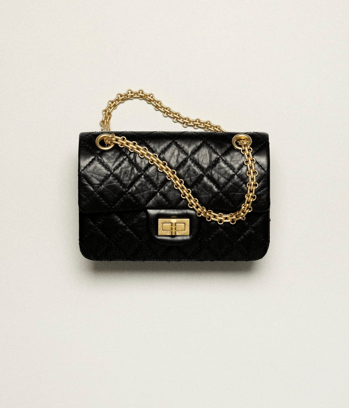This Mini Reissue 2.55 Single Flap Bag is crafted from black distressed calfskin with antique gold hardware, front flap with Mademoiselle turnlock closure, half-moon back pockets and interwoven gold chain links.