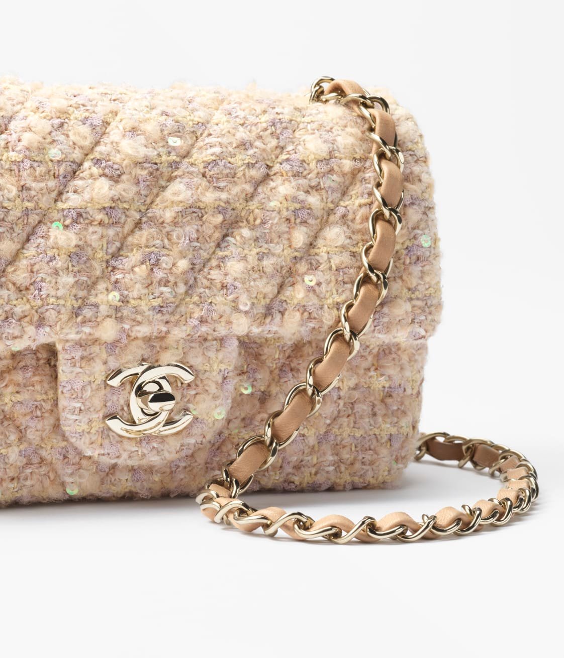 This Chanel Mini Rectangular Flap Bag in beige and white tweed features light gold hardware, front flap with CC turnlock closure, half-moon back pockets and interwoven light gold chain links, and a beige shoulder/crossbody strap.