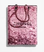 This shopping bag is crafted from dark pink sequins and ribbed satin and leather with black hardware, tonal stitching, a removable pouch inside, interwoven black metal chain links and dark pink leather shoulder strap.