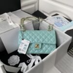 This small Classic Double Flap Bag is crafted in light blue caviar leather and features light gold hardware, front flap with signature CC turnlock closure, half-moon back pocket, adjustable interwoven light gold chain and light blue leather shoulder strap.