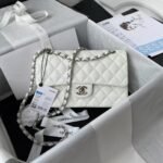 This small Classic Double Flap Bag is crafted in white caviar leather with silver hardware, front flap with signature CC turnlock closure, half-moon back pocket, adjustable interwoven silver chain and white leather shoulder strap.