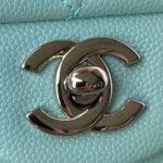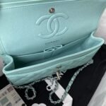 This small Classic Double Flap Bag in light blue caviar leather with silver hardware features a front flap with signature CC turnlock closure, half-moon back pocket, adjustable interwoven silver chain and light blue leather shoulder strap.