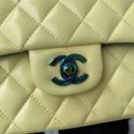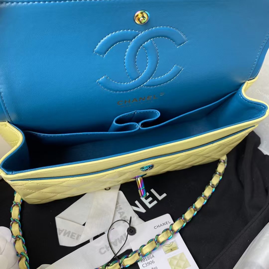 This yellow lambskin classic double flap bag with gradient metal hardware features the signature CC turnlock closure on the front flap, half-moon back pocket, adjustable gradient interwoven chain and yellow leather shoulder strap.