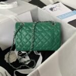 This small classic double flap bag is crafted in green lambskin with silver hardware, front flap with signature CC turnlock closure, half-moon back pocket, adjustable interwoven silver chain and green leather shoulder strap.