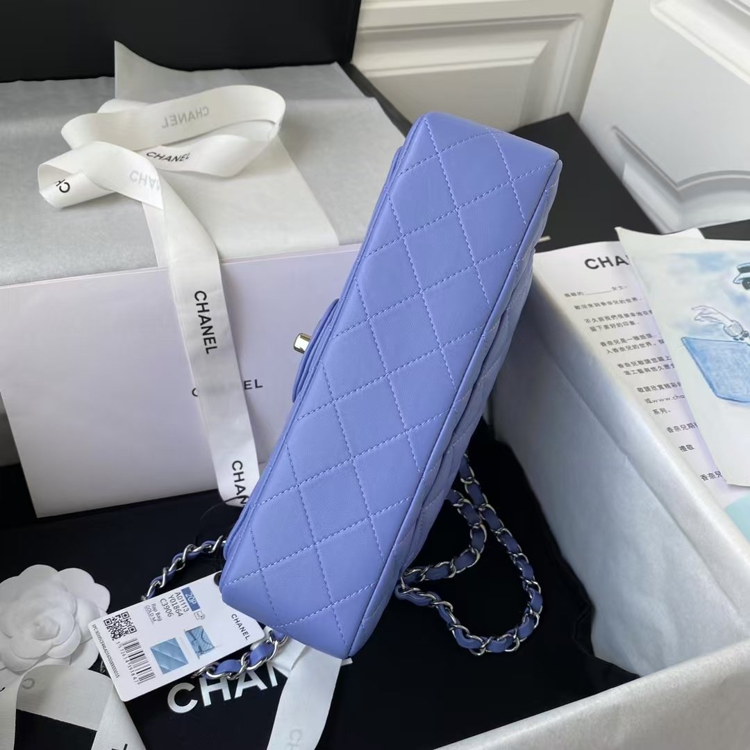 This small Classic Double Flap Bag is crafted from lavender lambskin with silver-tone hardware, featuring the signature CC turnlock closure on the front flap, half-moon back pockets, adjustable silver-tone interwoven chain links and a lavender leather shoulder strap.