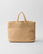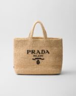 This tote bag with a soft, deconstructed design is made of raffia-effect yarn, a light material with a summery mood. Prada’s large, iconic lettering logo embroidered on the front enhances the silhouette.