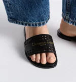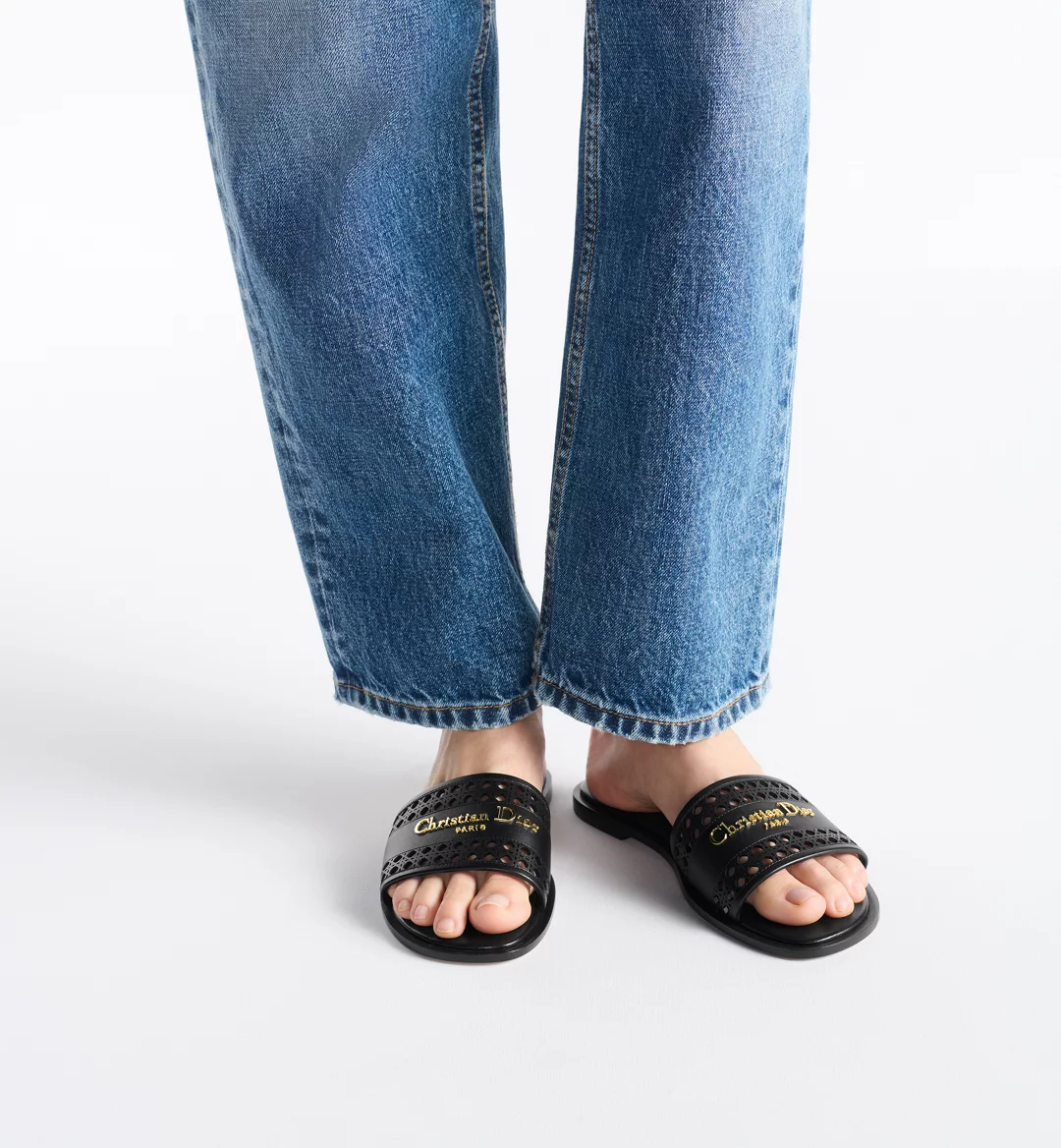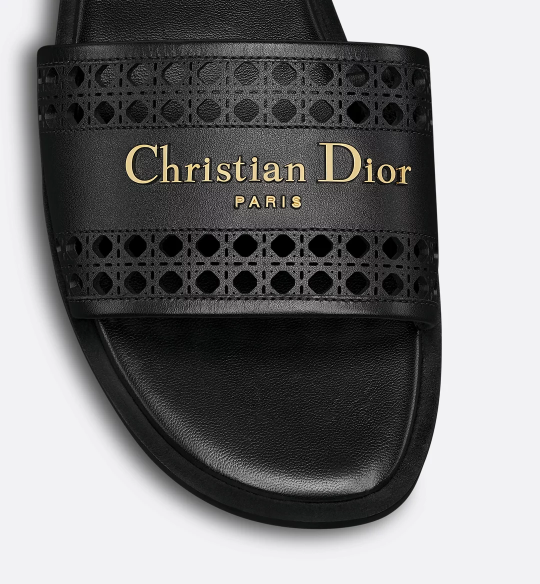 The D-Lane slide is an emblematic style with a timeless look. The black openwork Microcannage calfskin upper is adorned with a gold-finish metal Christian Dior Paris signature, adding an instantly recognizable touch. The padded leather insole offers ultimate comfort while the streamlined design makes it easy to slip on for a laid-back look.