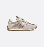 New for Summer 2025, the D-Sketch sneaker reflects a hallmark retro aesthetic. Combining gold-tone crinkled lambskin and gold-tone laminated calfskin, it features printed markings inspired by the production stages of shoemaking, panels in beige suede calfskin and double lacing. The handwritten Christian Dior Paris signature appears on the sides, while a Christian Dior Paris panel and tag adorn the heel counter and tongue. Complete with a thin sole in two-tone rubber, the sneaker will lend a couture touch to any casual look.